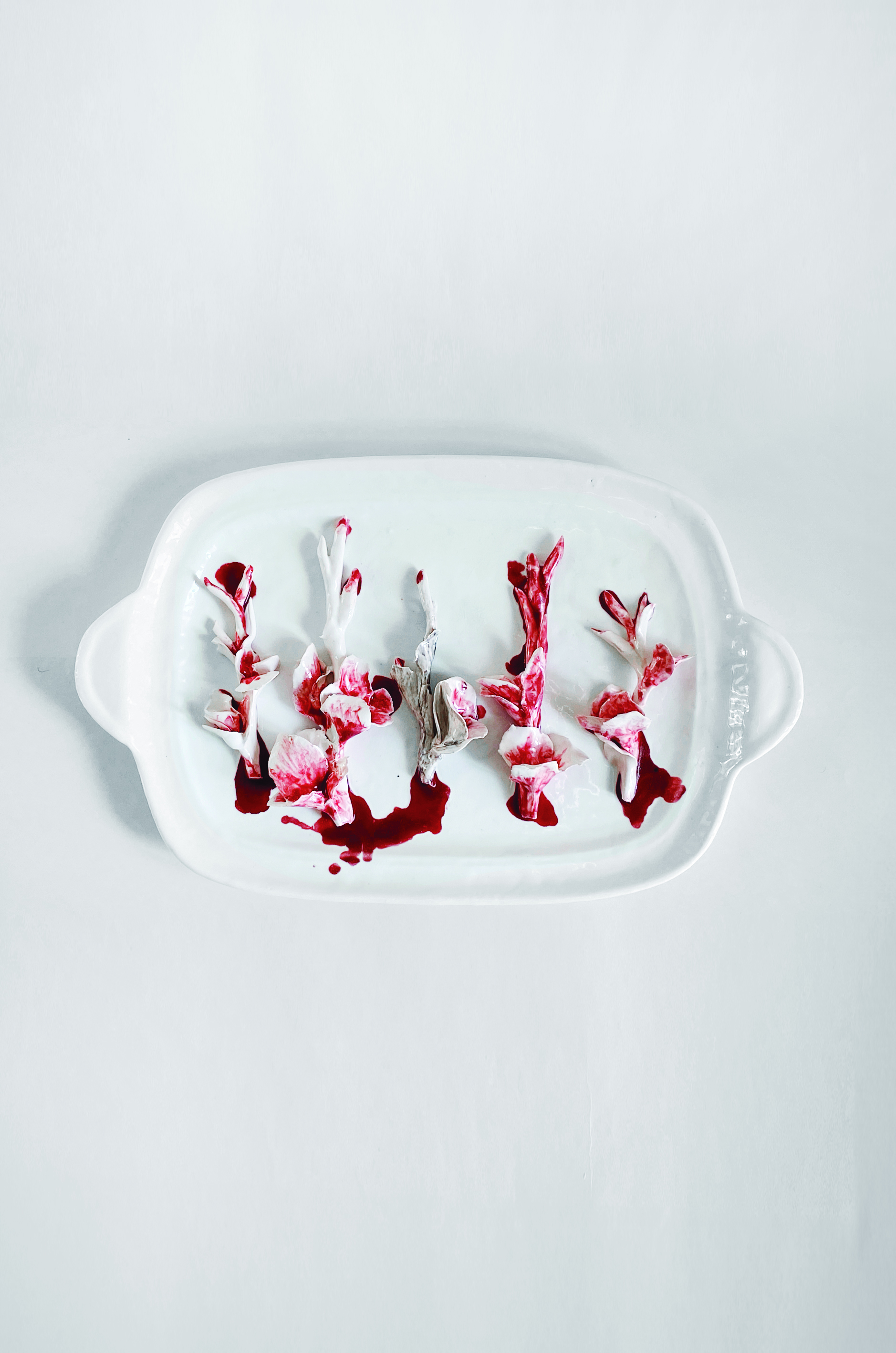 Farnaz Rabiejah wishes to inscribe her ceramics in the long lineage of Iranian ceramics, made up partly of traditional techniques and partly of innovation. She doesn't want to diverge or shock. And yet, by taking up the gladiolus motif, a powerful symbol of the war between Iraq and Iran between 1980 and 1988, and by raising the thorny issue of identity - Iranian on the one hand, and the underlying question of Iranian women on the other - Farnaz Rabiejah creates shocking works. Like Ronsard, Persian art knew how to put the allegorical significance of flowers into words and images. Dazzlingly beautiful one day, dead the next, the flower simultaneously lends its vulnerability and ephemeral nature to the representation of the cycle of life and the female sex. (...)