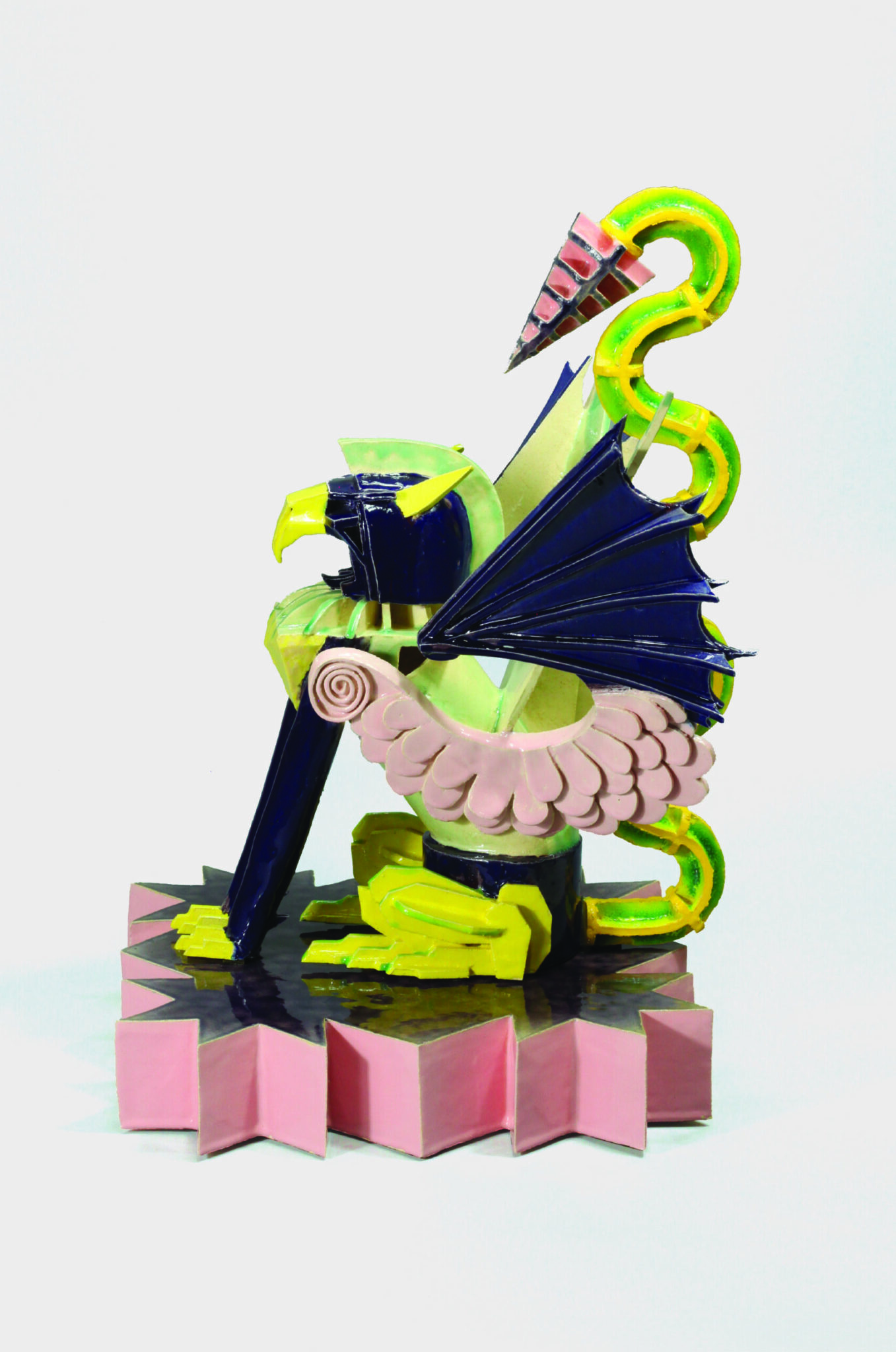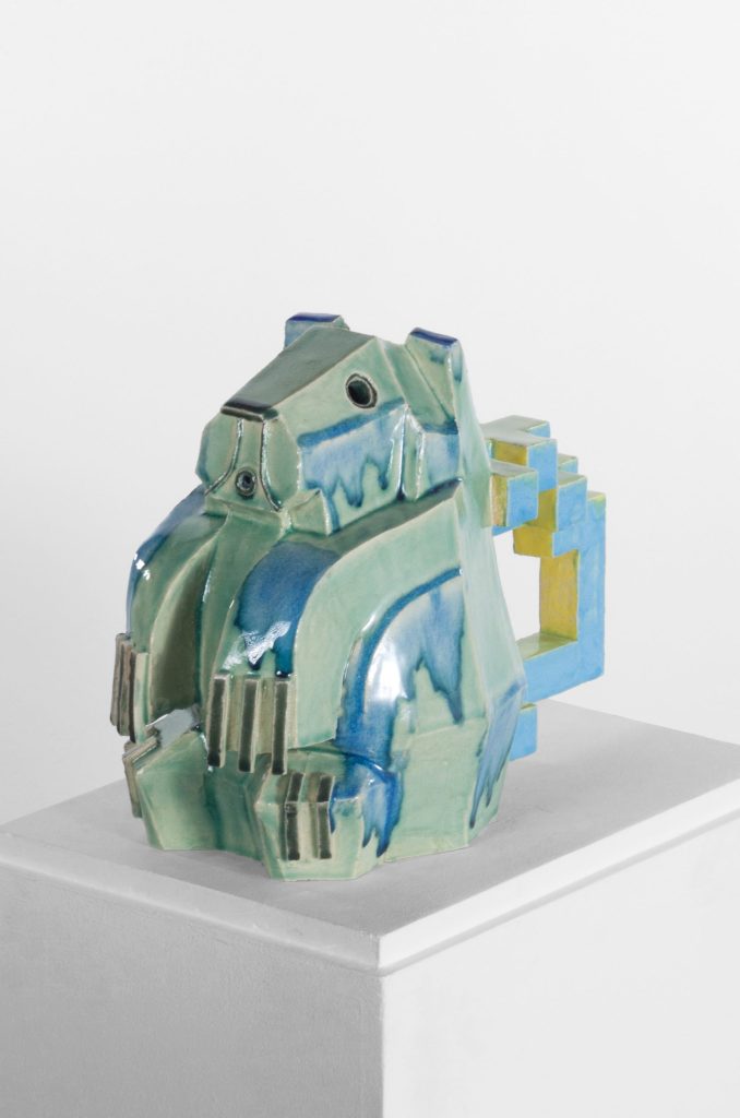 Jean-Sébastien Tacher's art seems to be an explosive blend of Art Deco and the postmodernism of Memphis, a new decorative language born, like the artist, at the dawn of the 1980s. After having performed extensively, initially with the Baoum collective, practised chainsaw woodcarving and created such extravagances as the construction, in Brittany, of a pagoda for a Vietnamese princess... the artist turns to ceramics to carve a hyper-decorative furrow fed by all the extravagances of Pop culture. (...)